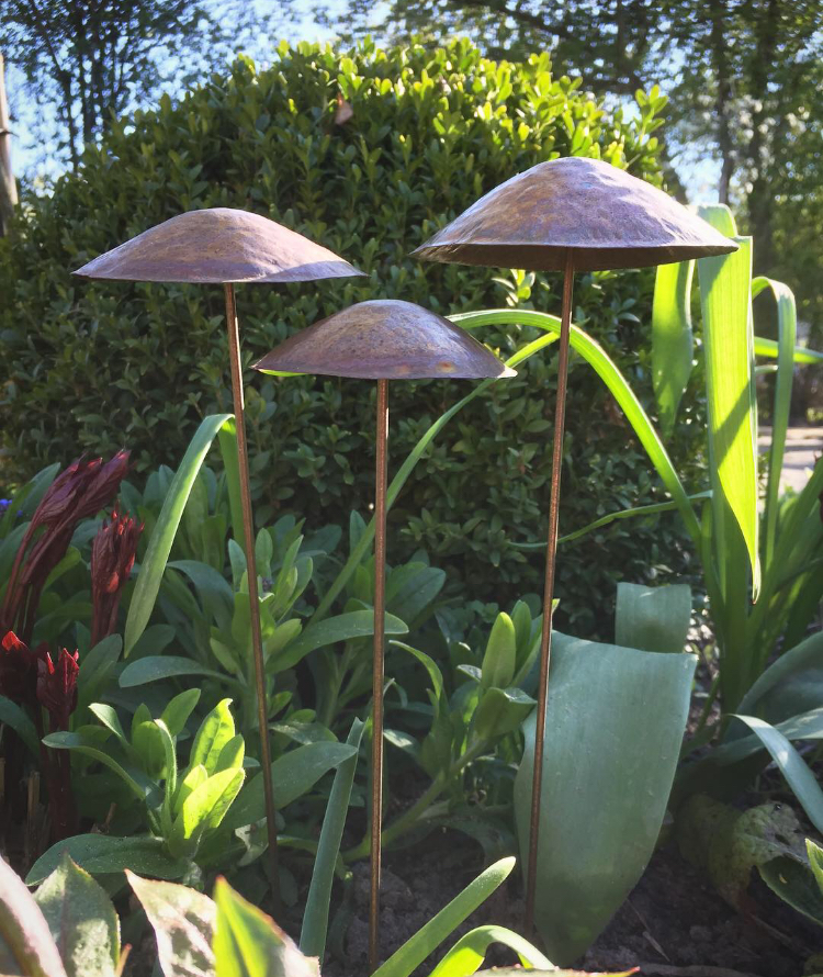3 stk håndlavede svampe i kobber. Svampene vil med tiden få et smukt irret udtryk hvis de står udenfor.